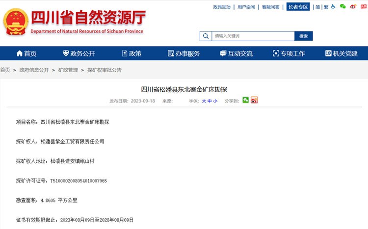 据四川省自然资源厅,四川省松潘县东北寨金矿床勘探项目探矿权人为松潘县紫金工贸有限责任公司,勘查面积4.8605平方公里,证书有效期限起止为2023年08月09日至2028年08月09日。